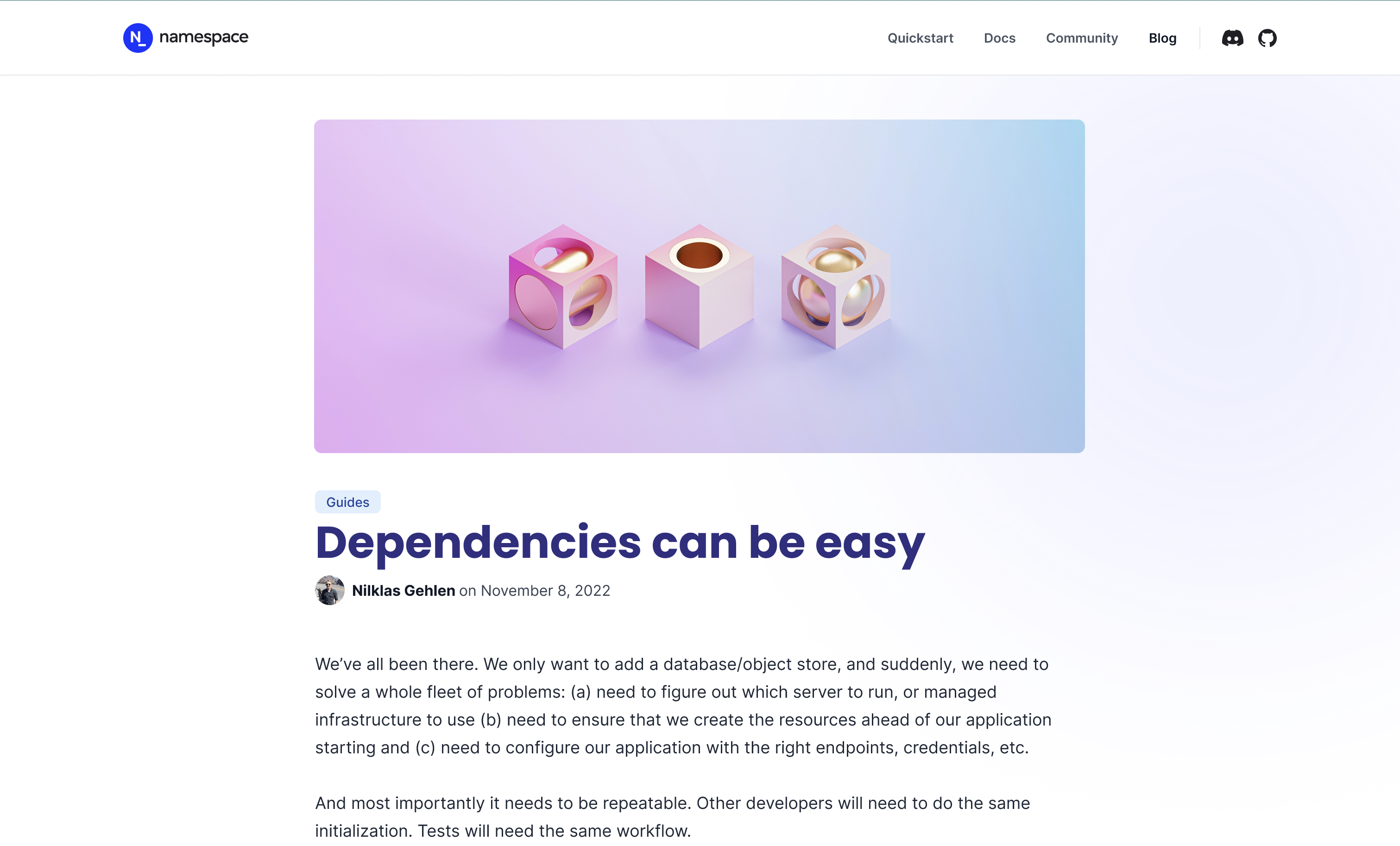- Dependencies can be easy: which showcases how Namespace helps you manage dependencies, relying on reusable building blocks.